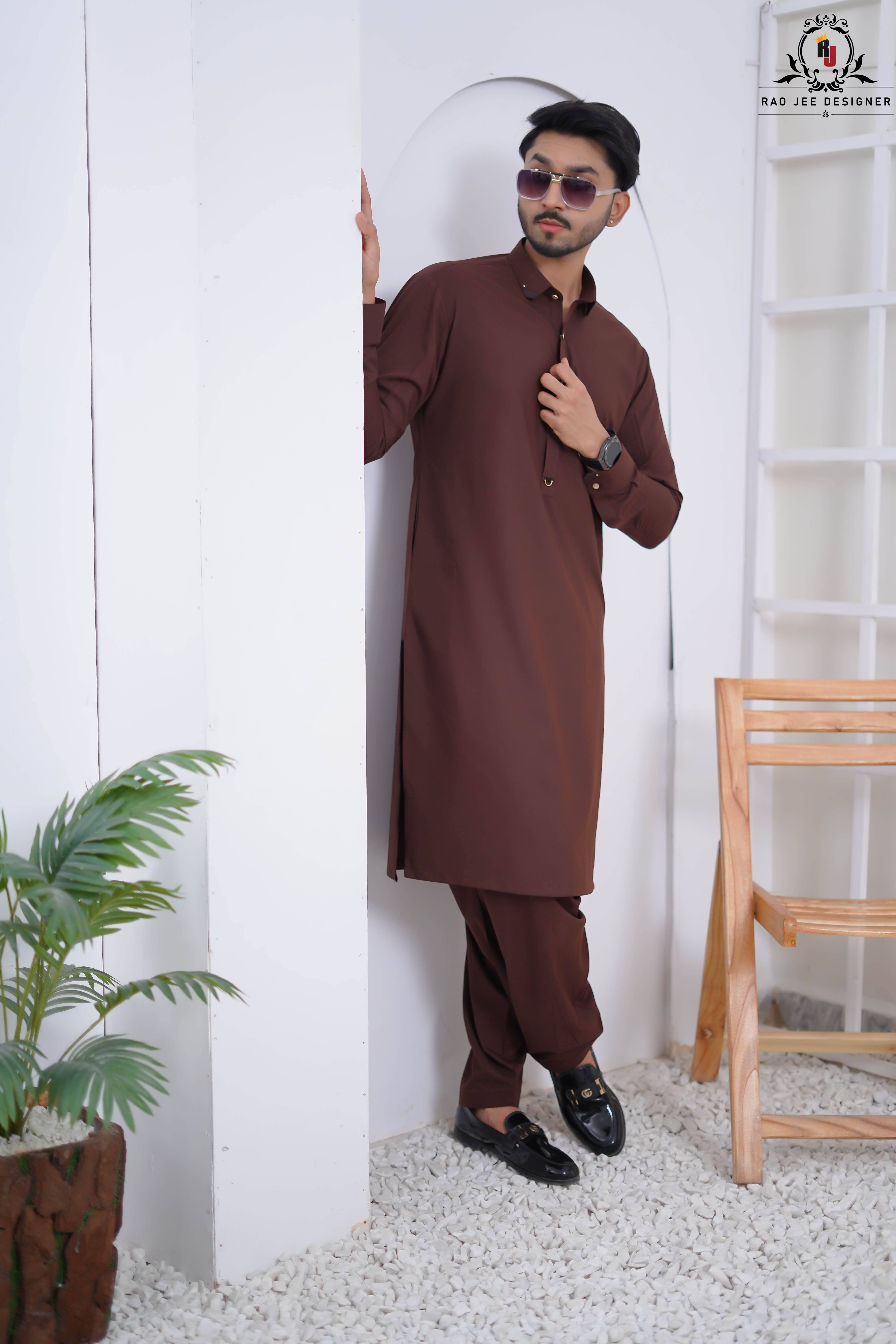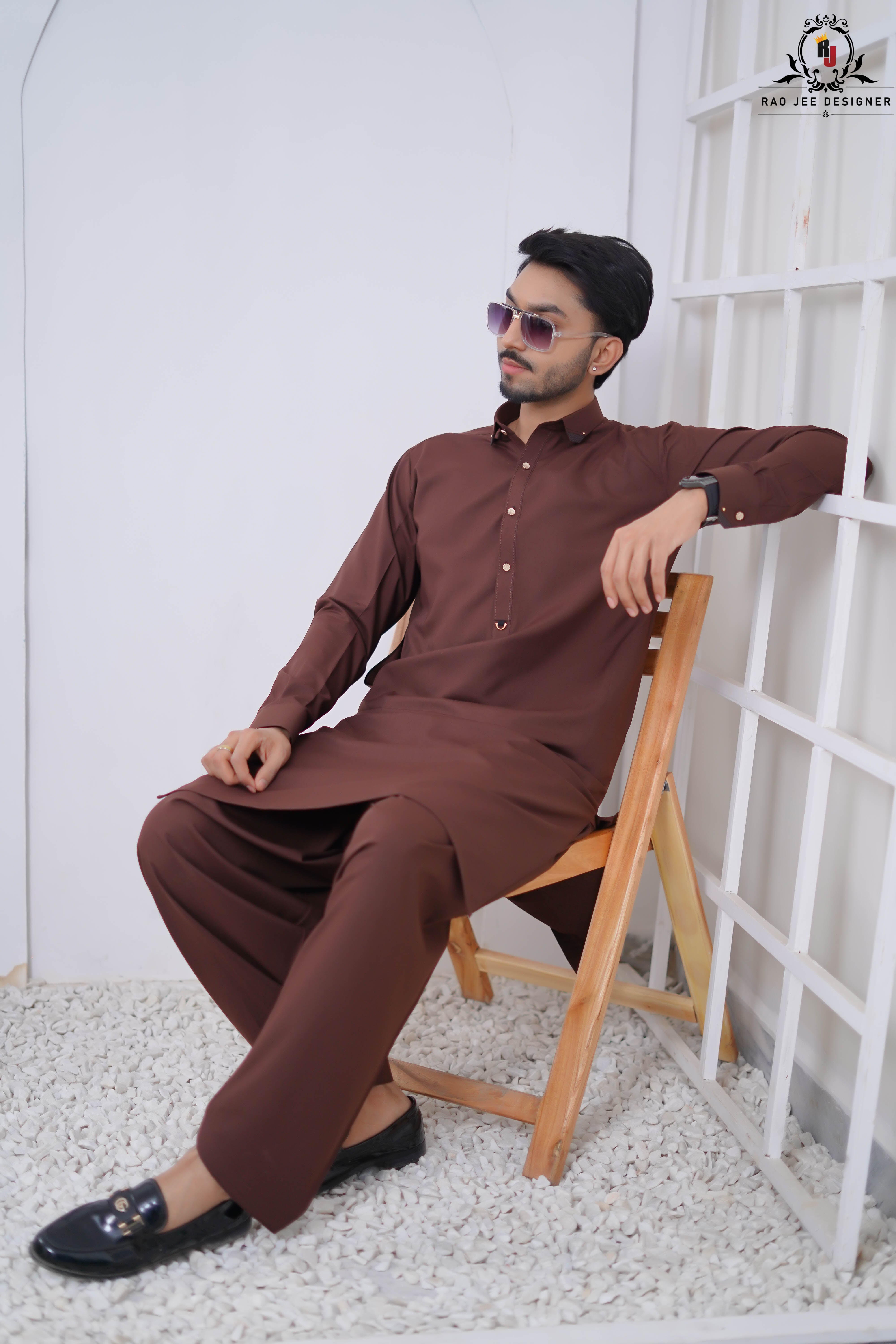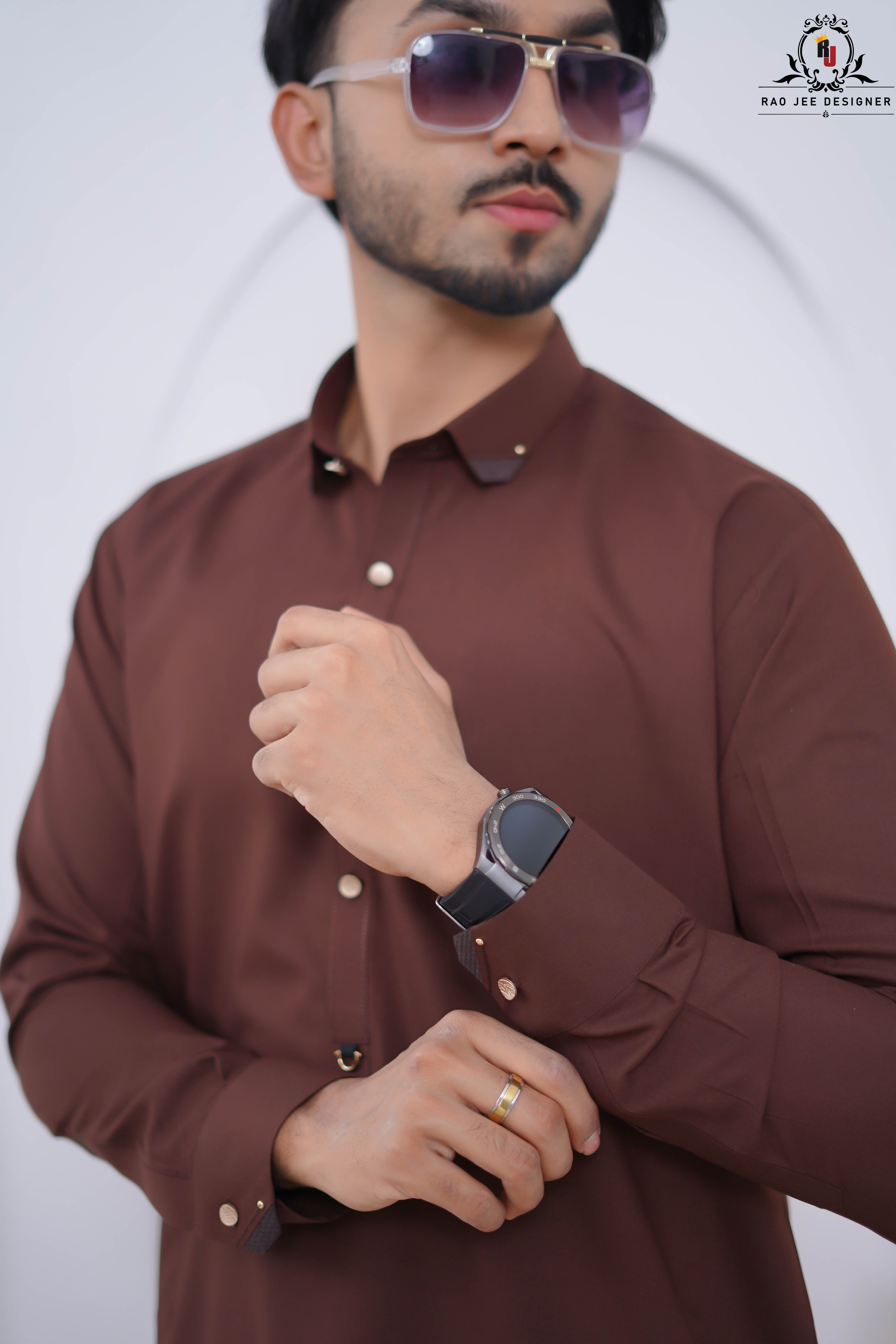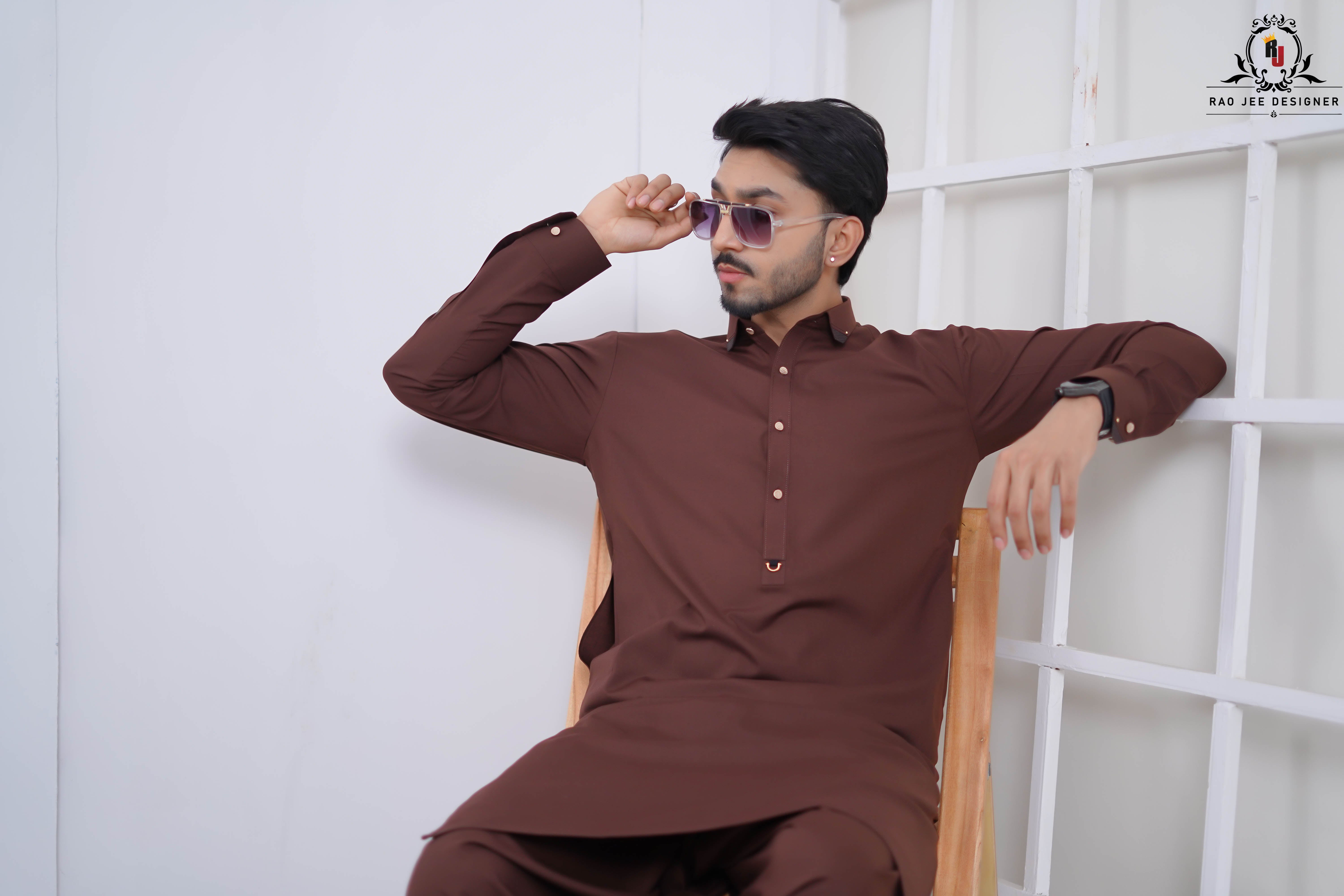 Experience the perfect blend of comfort and class with our Chocolate Brown Kameez Shalwar. This piece from the Rao Jee Designer collection features a sophisticated band collar with subtle contrast tipping, giving it a unique designer edge. The earthy brown tone is versatile and masculine, perfect for the gentleman who prefers a grounded yet polished aesthetic.