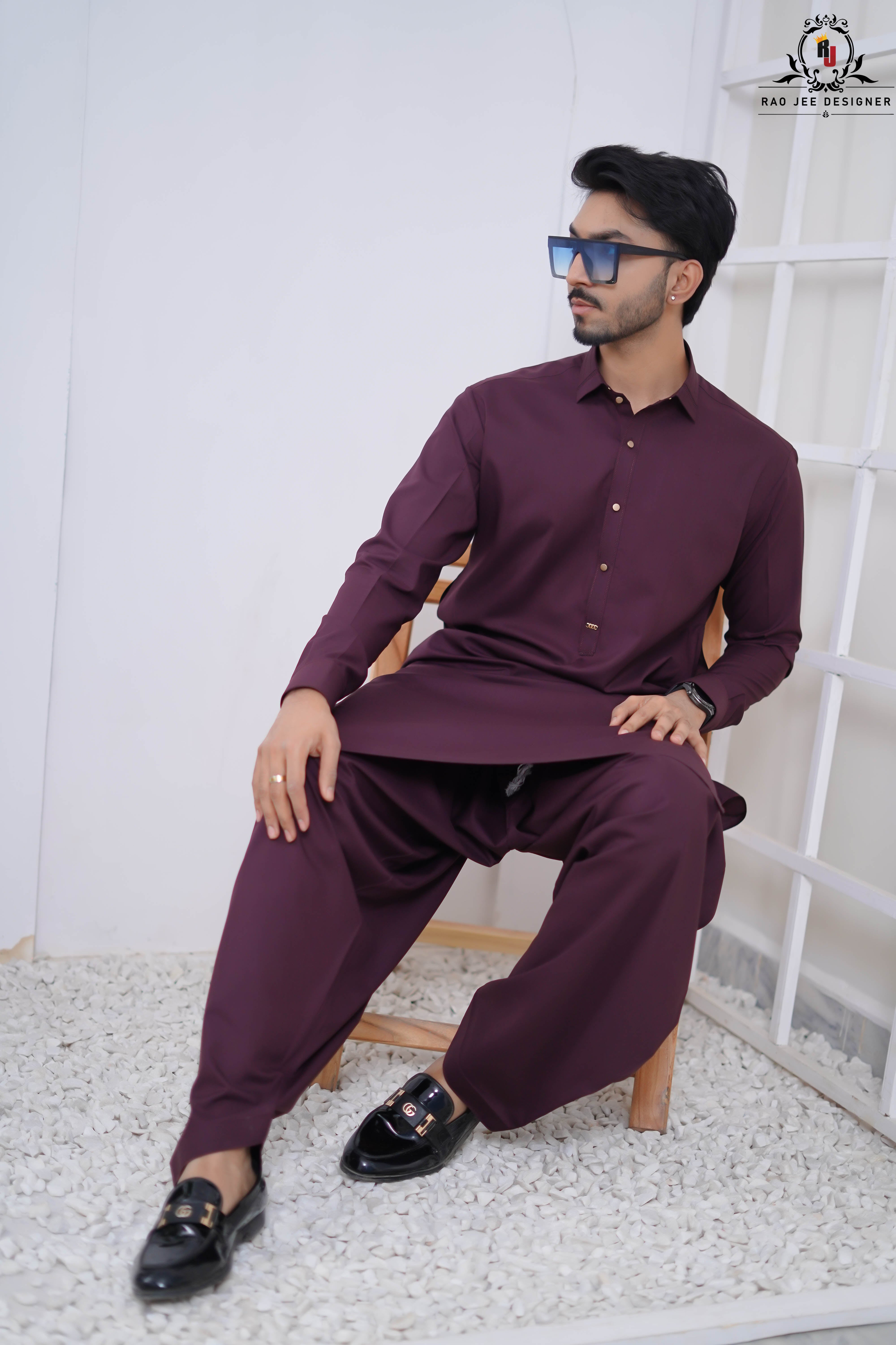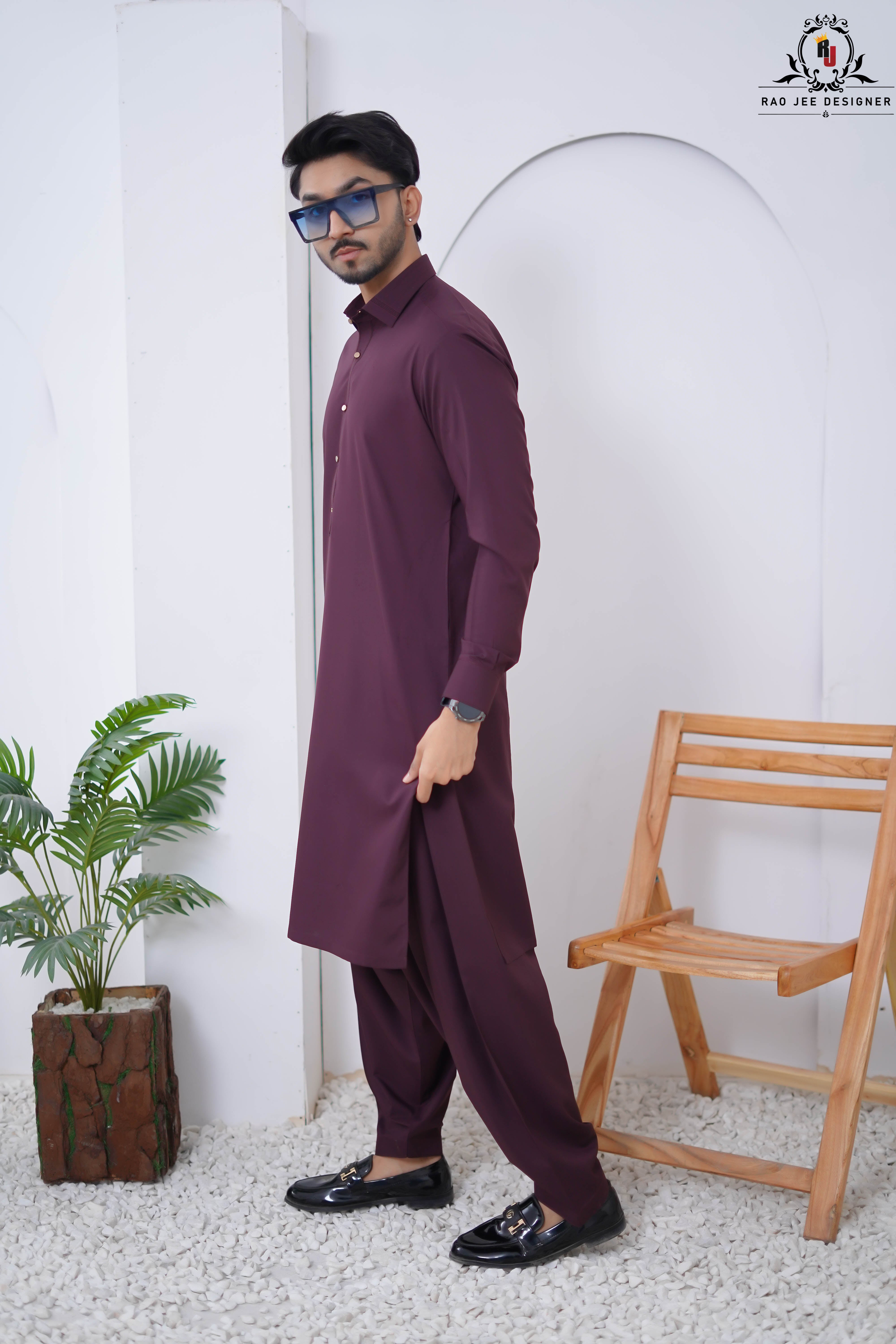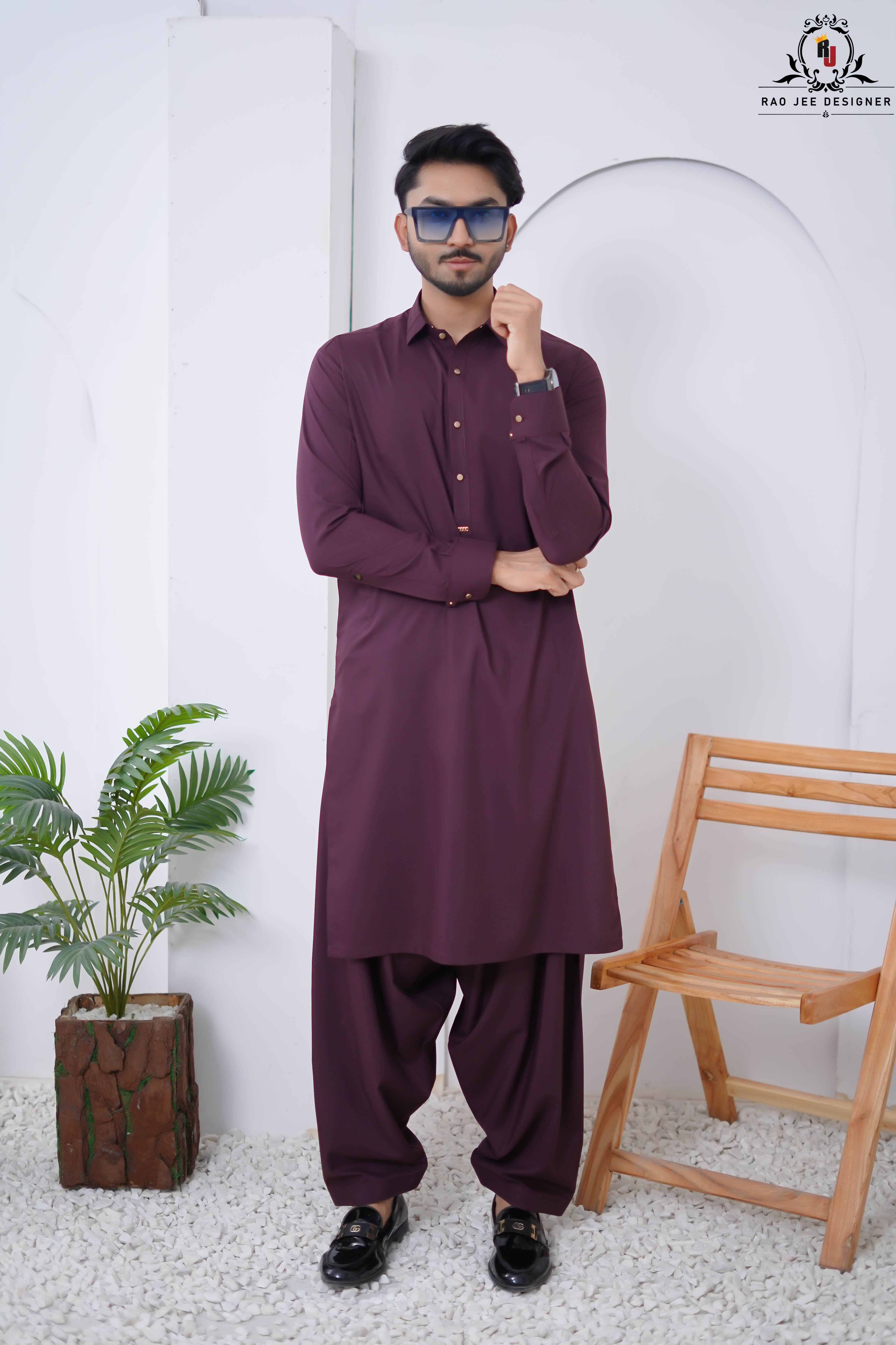 Elevate your ethnic look with this striking Plum Purple Kameez Shalwar from the Rao Jee Designer Collection. Designed for the modern man who values both tradition and trend, this outfit features a classic shirt collar and a rich, deep hue that stands out in any crowd. The premium fabric provides a structured yet comfortable fit, making it an essential for your formal wardrobe.