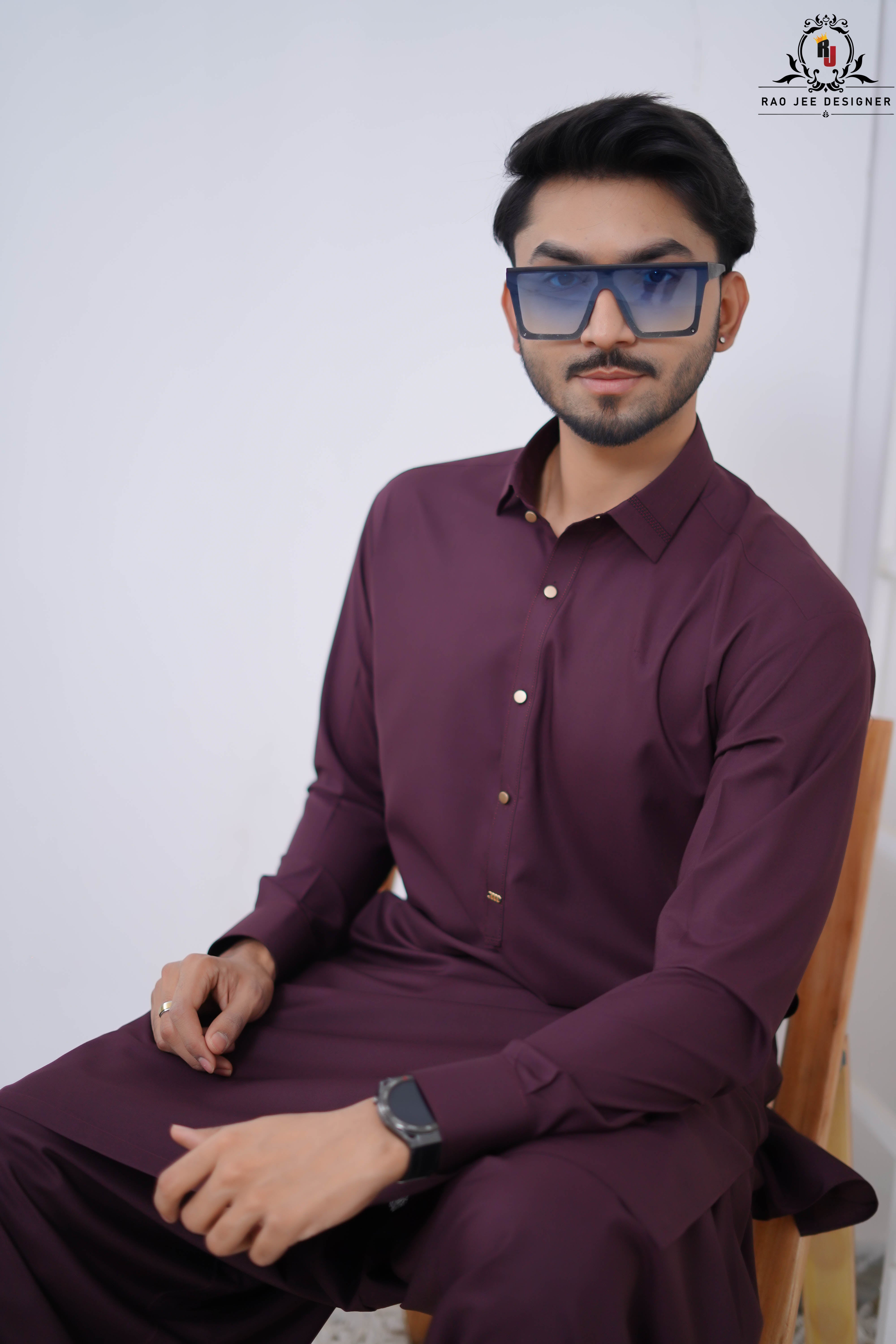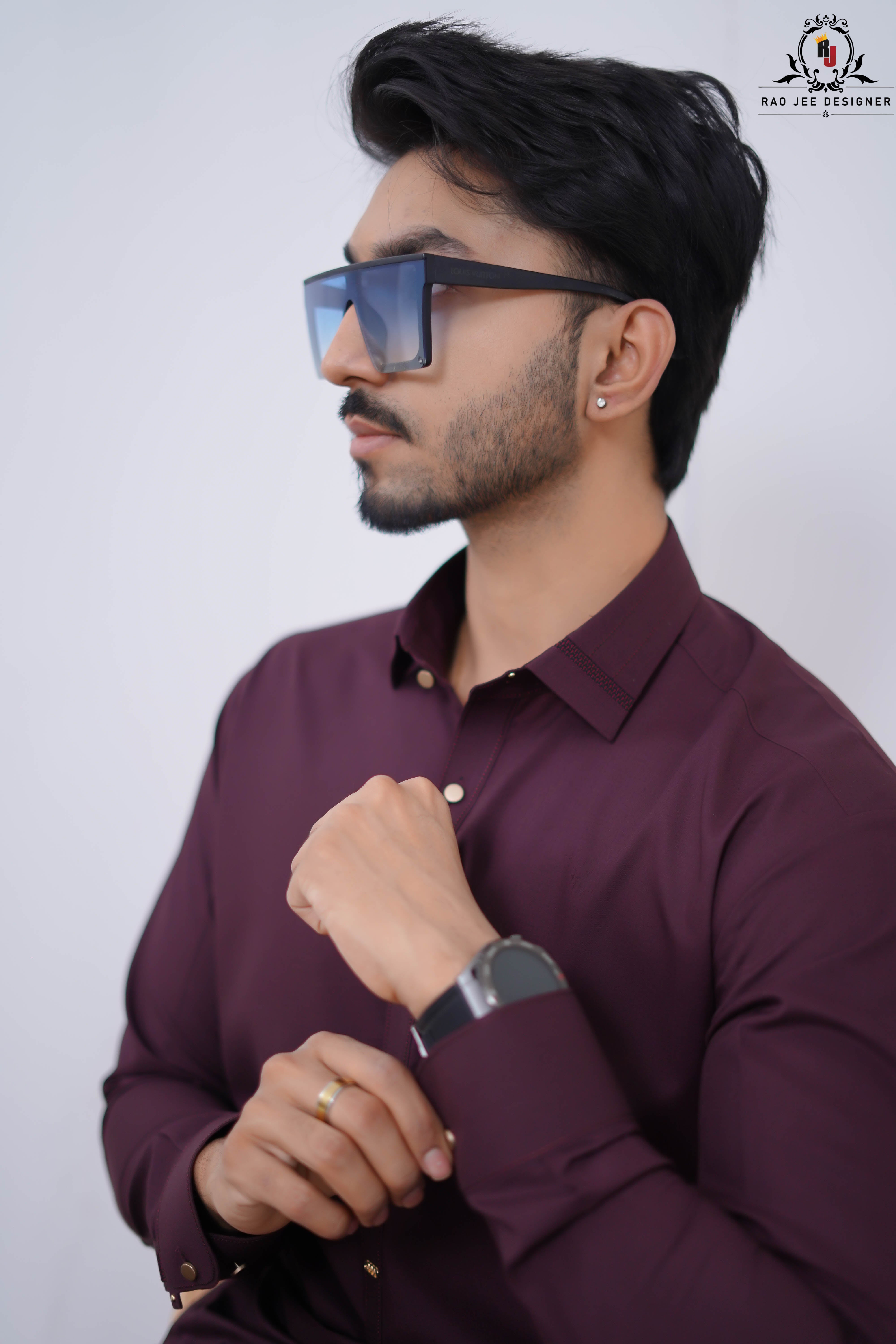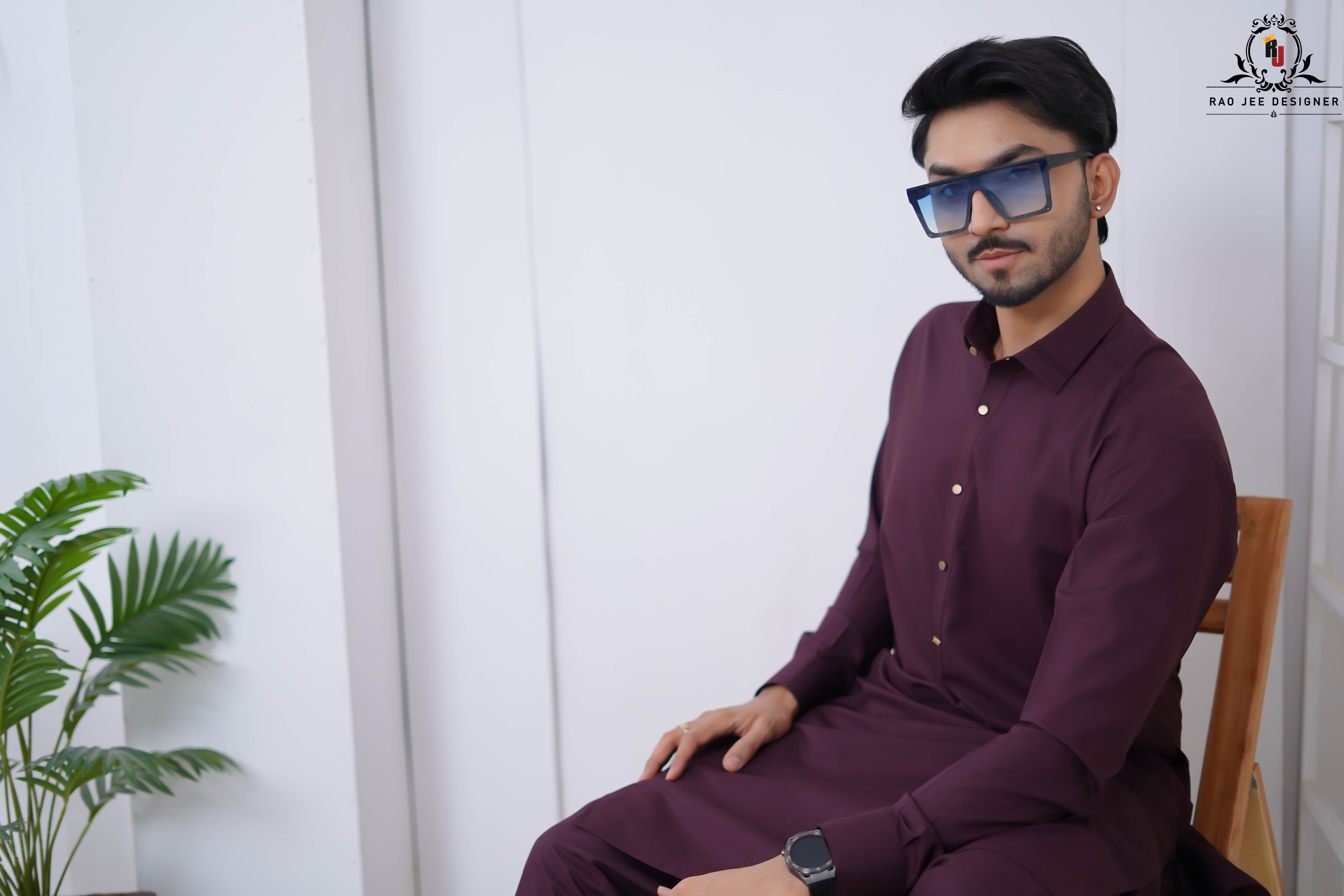 Elevate your ethnic look with this striking Plum Purple Kameez Shalwar from the Rao Jee Designer Collection. Designed for the modern man who values both tradition and trend, this outfit features a classic shirt collar and a rich, deep hue that stands out in any crowd. The premium fabric provides a structured yet comfortable fit, making it an essential for your formal wardrobe.