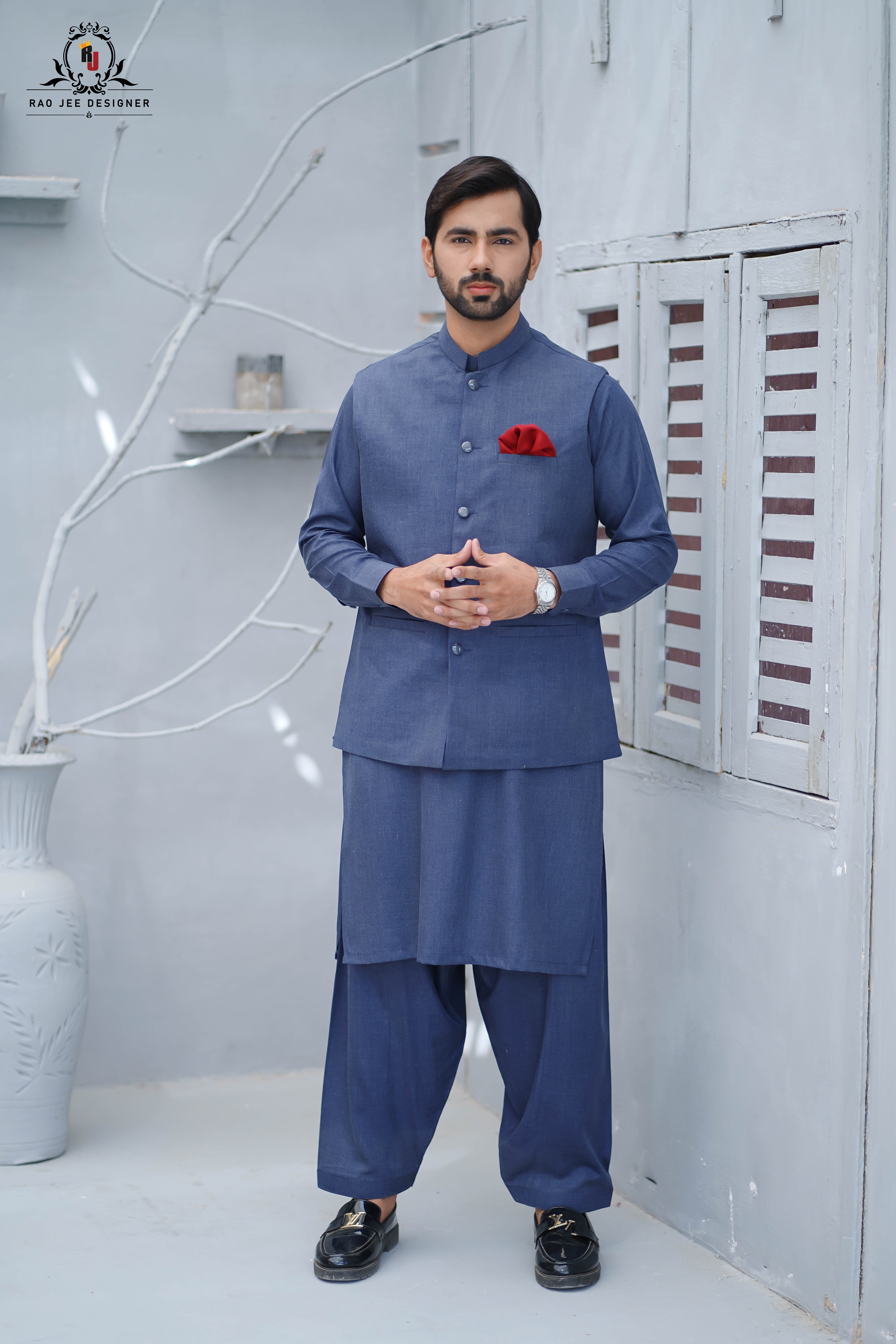 Elevate your classic look with the Premium Riwayaat Collection Kameez Shalwar and finely crafted waistcoat by Rao Jee Designer. Designed for weddings, festive events, and formal gatherings, this ensemble combines tradition with modern finesse. Made from premium Wash & Wear fabric and detailed with metallic waistcoat buttons and double pockets, it delivers unmatched comfort, style, and confidence with every