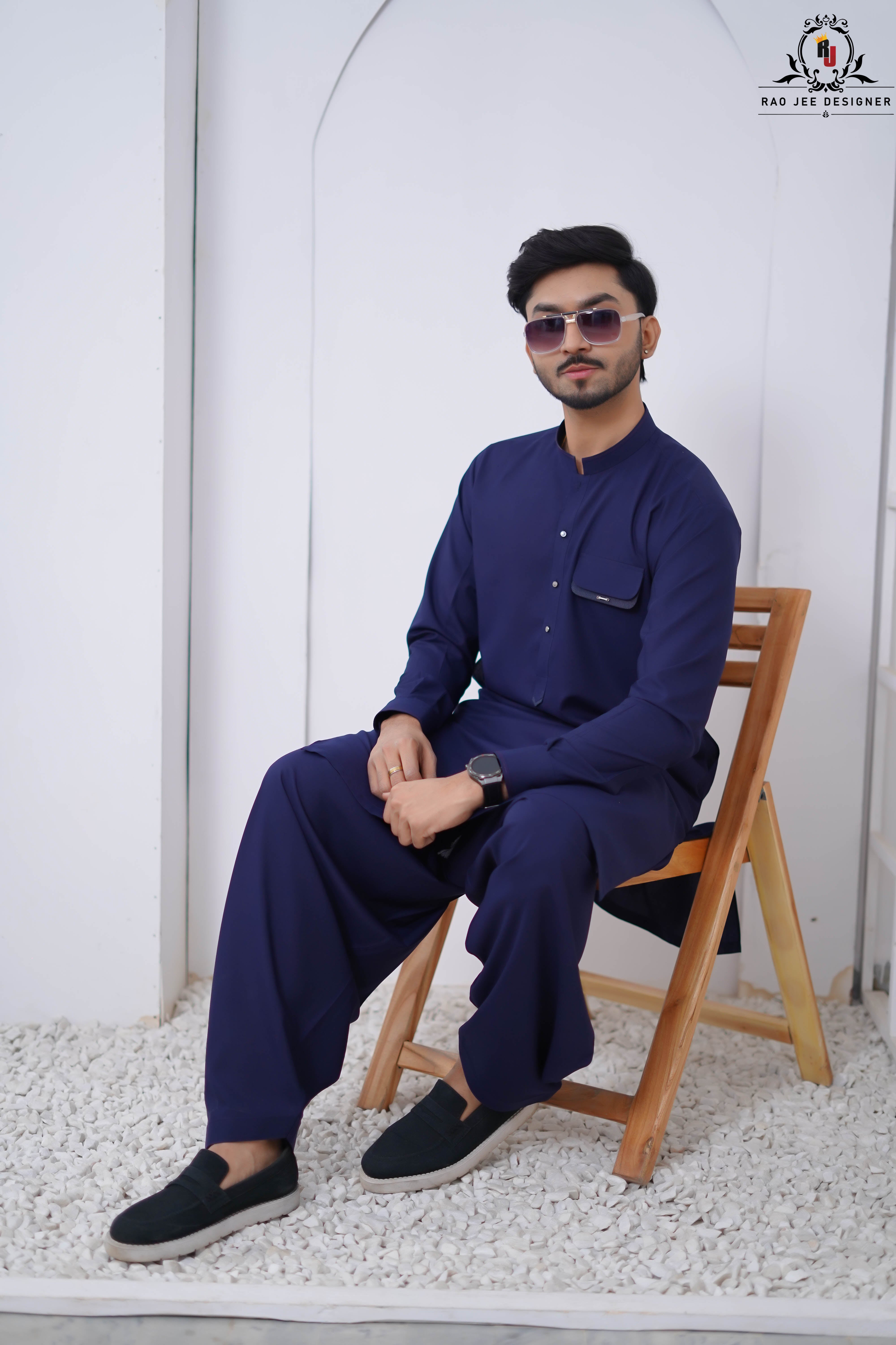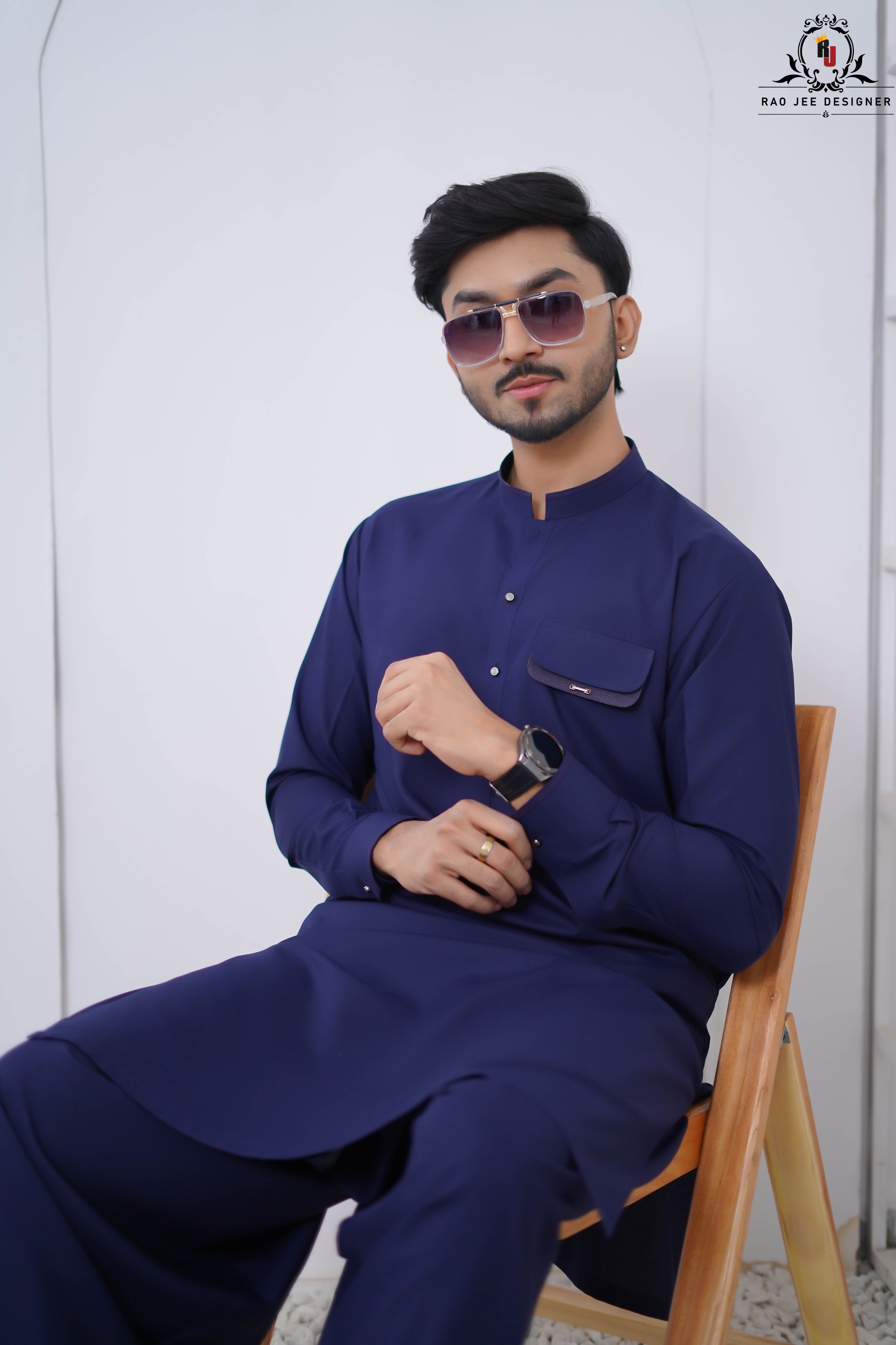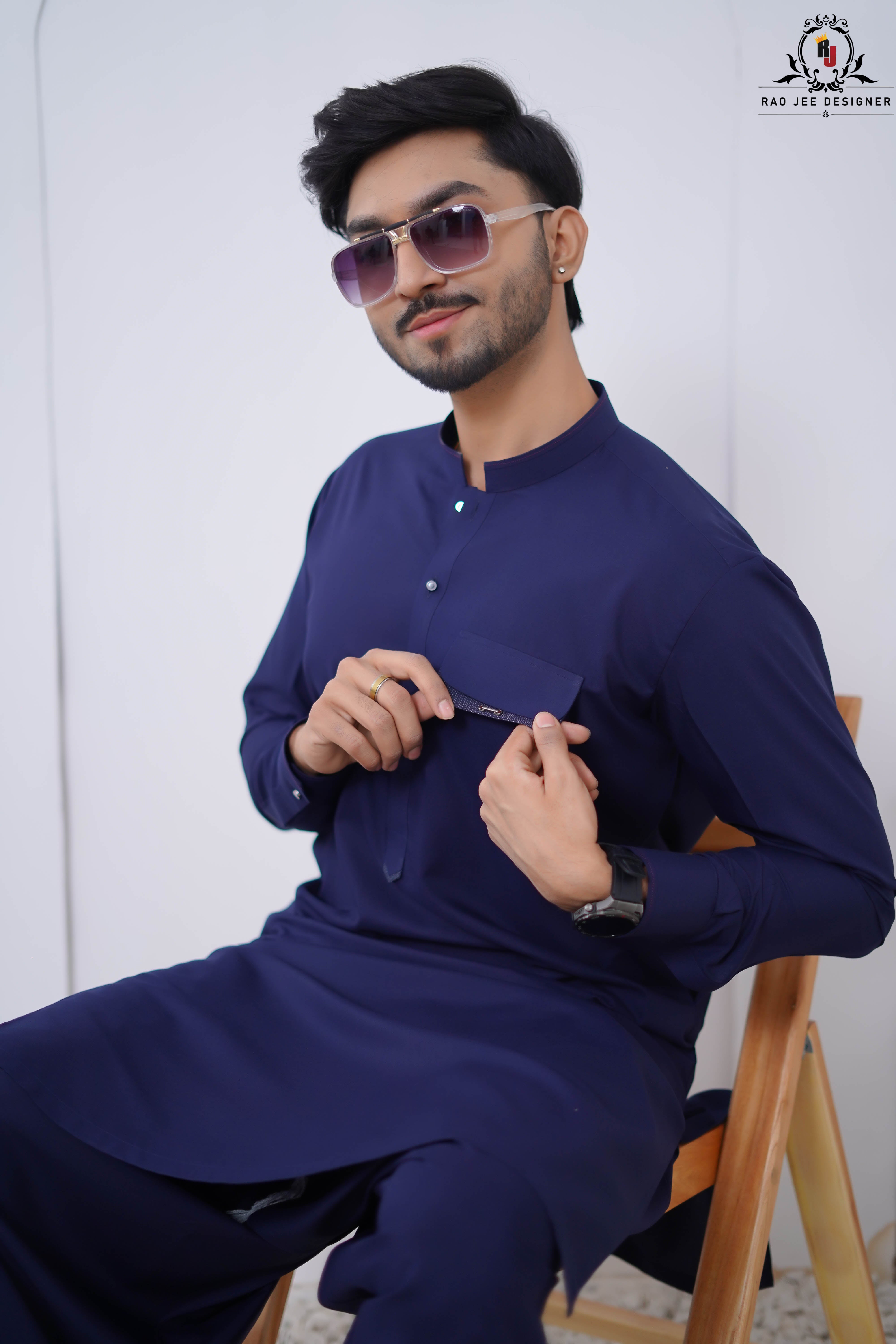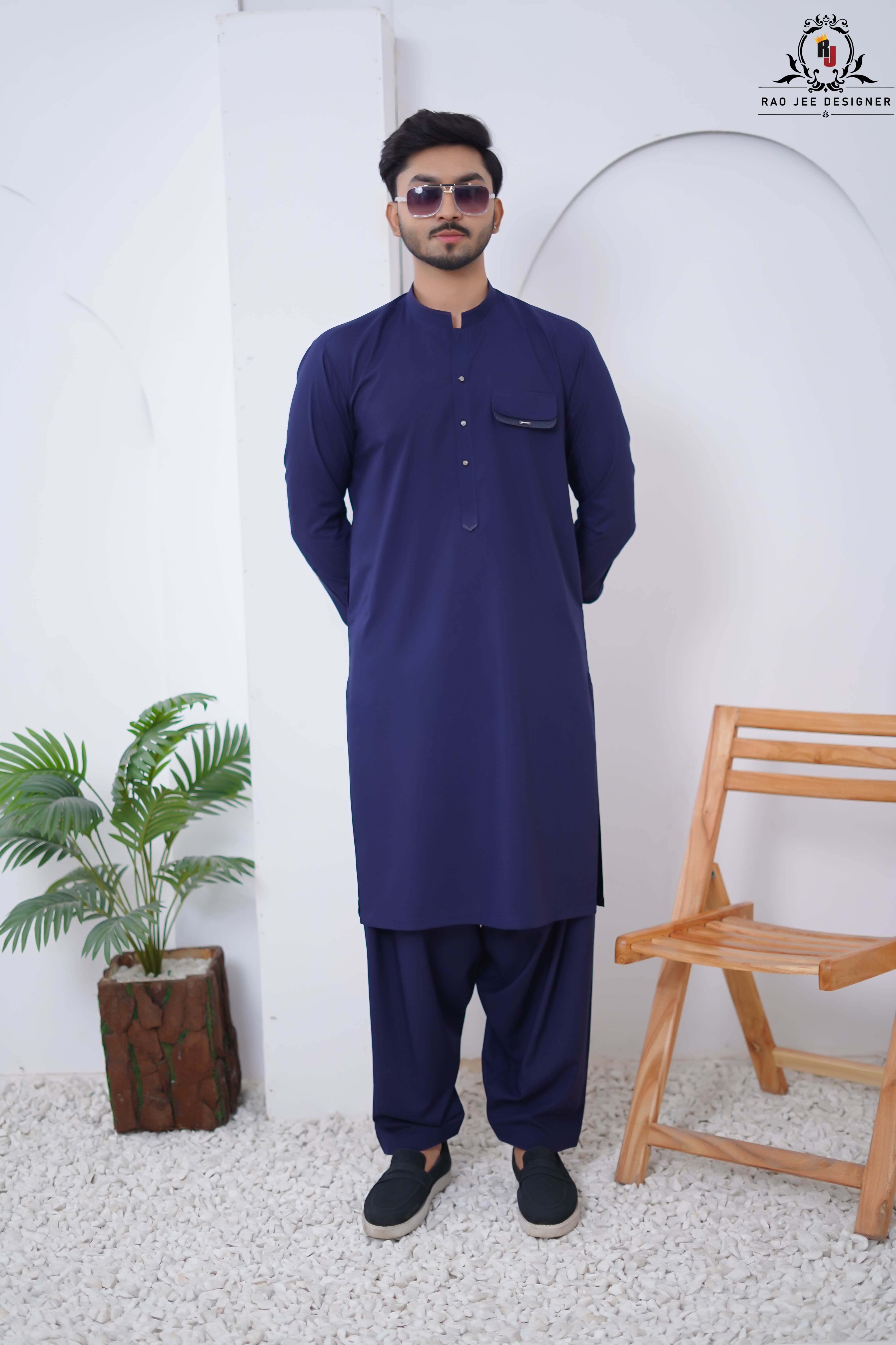 Modernize your look with the Indigo Blue Kameez Shalwar. This design by Rao Jee Designer features a front flap pocket and a sleek band collar, offering a slightly more utility-inspired and contemporary vibe to the traditional silhouette.