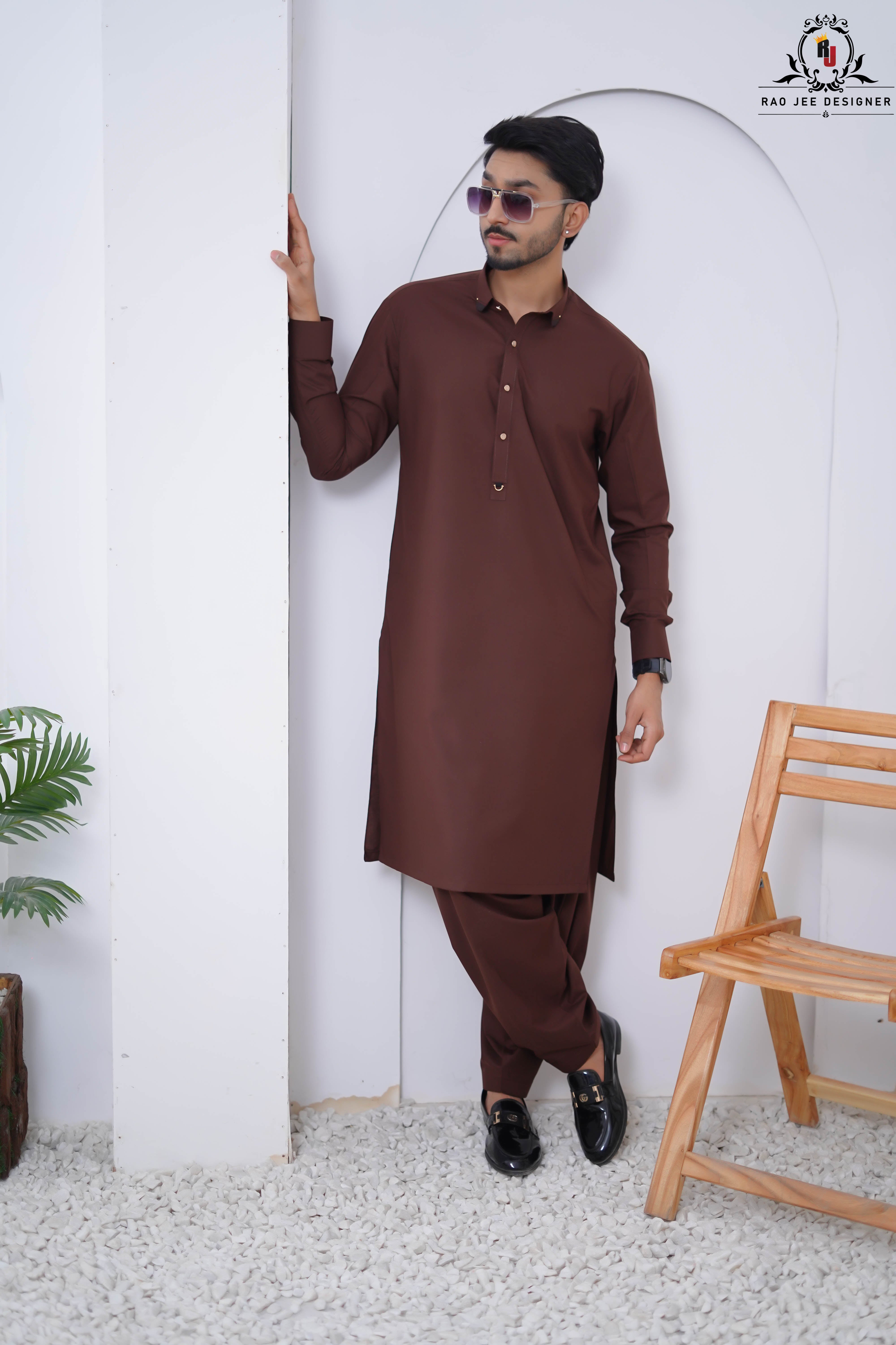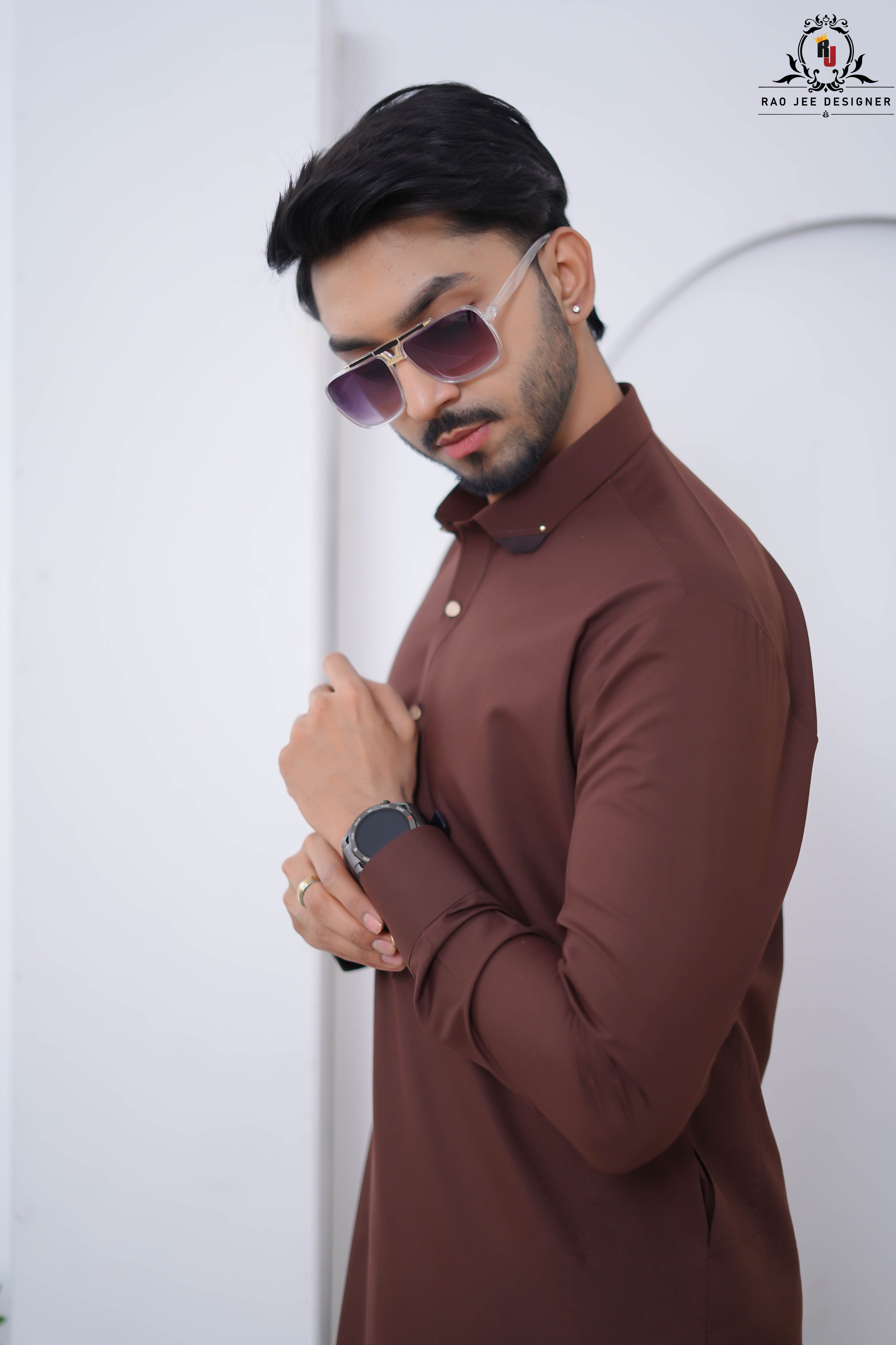 A deep, rich Coffee Brown that exudes authority and grace. This article features a unique "button-down" style band collar with metallic studs, adding a hint of modern ruggedness to the traditional Kameez Shalwar.